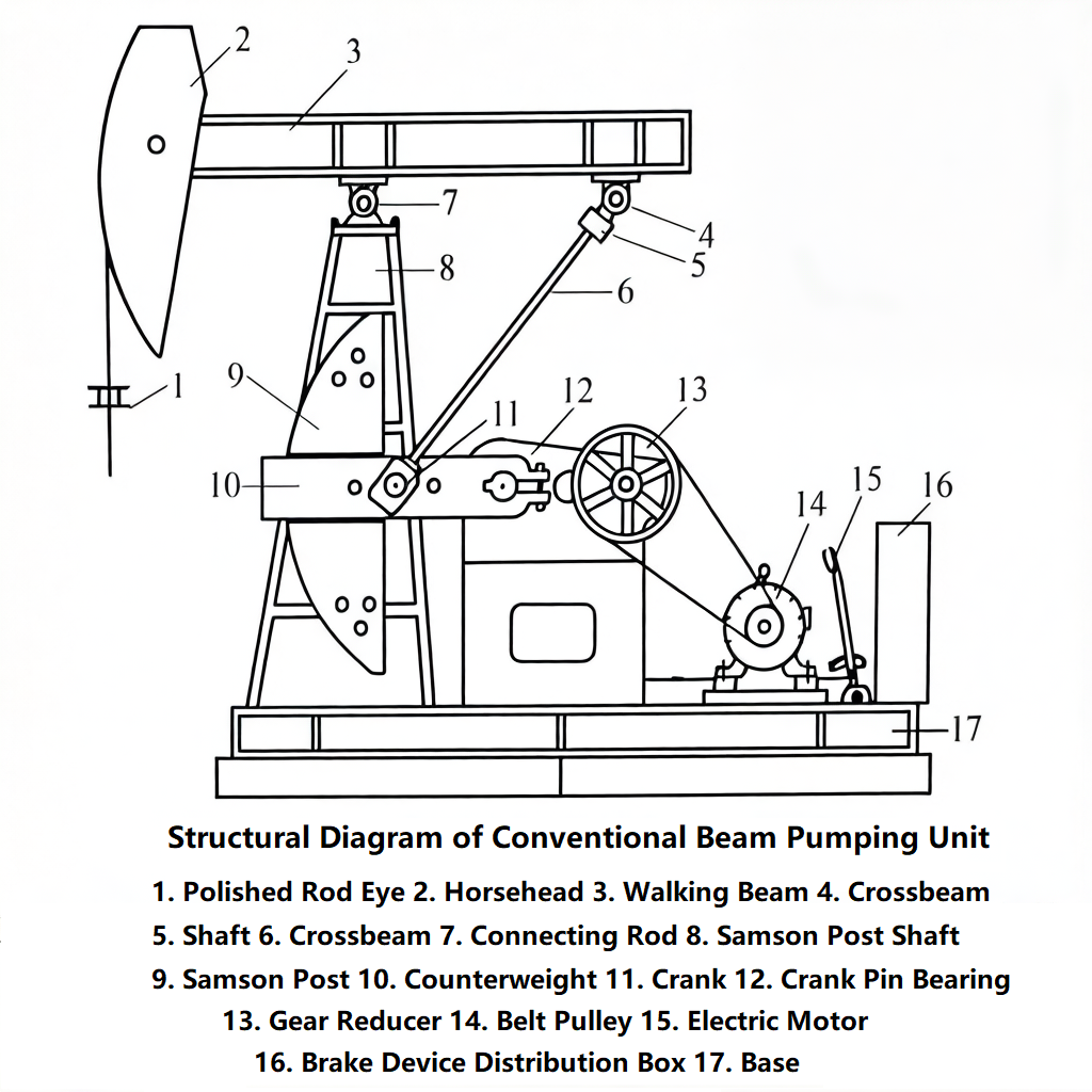 - Transmission System: The reducer (reduction ratio ~20:1) outputs shaft rotation, driving the crank via a connecting rod to make the beam swing up and down.